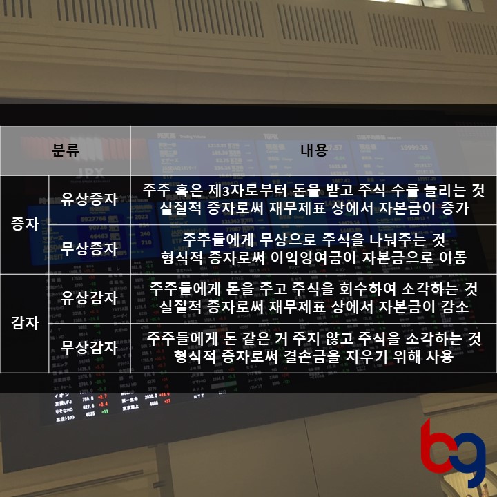 증자는 기업이 자본금을 늘리기 위해 주식 수를 늘리는 것을 말합니다. 반대로 감자는 기업이 자본금을 줄이기 위해 주식 수를 줄이는 것을 말합니다. 그리고 증자와 감자는 각각 유상과 무상으로 구분됩니다.