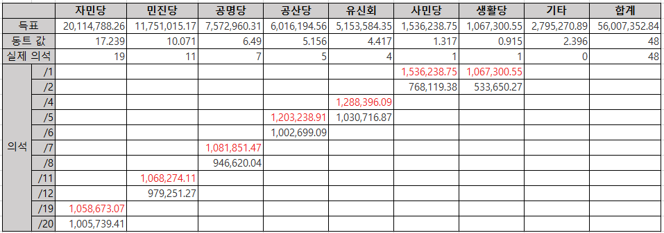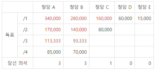 5개 정당이 총 7개 의석을 배분한다고 가정하면, 각 정당 별 의석수는 아래와 같다.