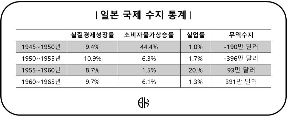1945년 8월 15일 태평양전쟁에서 일본이 패한 이후 연합군 최고사령부(이하 GHQ; General Headquarters)가 점령하던 7년은 오히려 일본경제가 후퇴기에서 부흥기로 넘어가는 시기였다. 패전 이후 600만명 정도의 일본인이 식민지로부터 돌아오면서 인구가 급증하고, 전쟁동안 주식인 쌀의 생산량이 절반 가량 줄어든 일본은 미국의 긴급 식량 지원으로 간신히 대규모 아사를 막을 수 있엇다. 다행이 자본과 노동 등 경제 기반은 전쟁과 전쟁 당시 대규모 본토 폭격에도 불구하고 충분한 수준을 유지하고 있었다. 일본 내 중화학공업은 전쟁을 주도했었던 산업인만큼 그대로 패전 이후 일본에게 남아있었고 빠른 시간 내로 전쟁 이전의 수준까지 돌아갔다. 그리고 노동력도 히키아게샤(引揚者, 식민지에서 귀국한 일본인)를 중심으로 인구가 급격하게 늘어난 상황이기에때문에 패전 이후의 일본에선 충분한 노동력이 있었다.