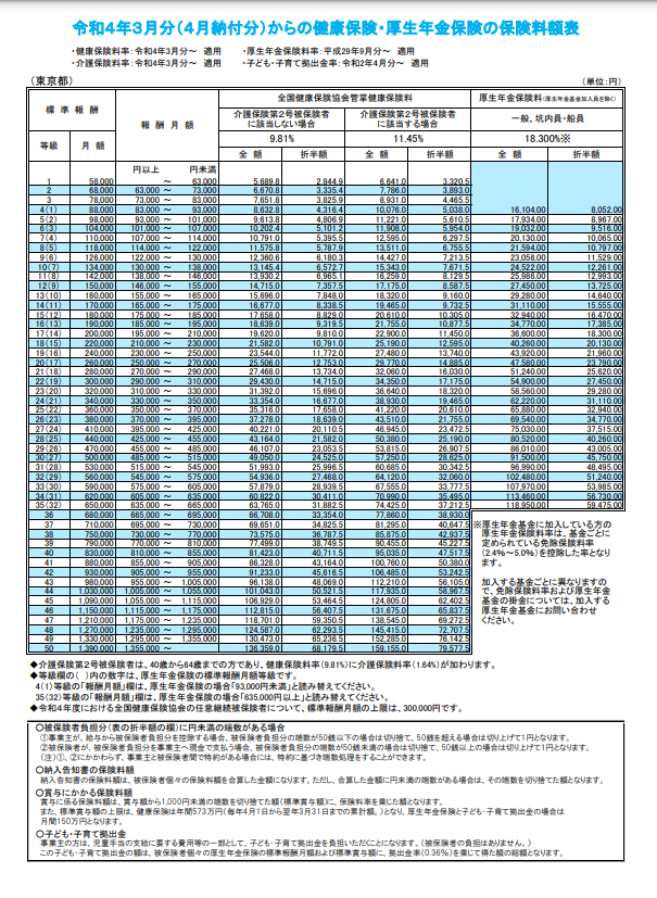 위 표는 전국건강보험협회가 발표한 레이와4년3월분 이후부터의 건강보험 및 후생연금보험의 보혐료액표(도쿄 기준) 자료입니다.