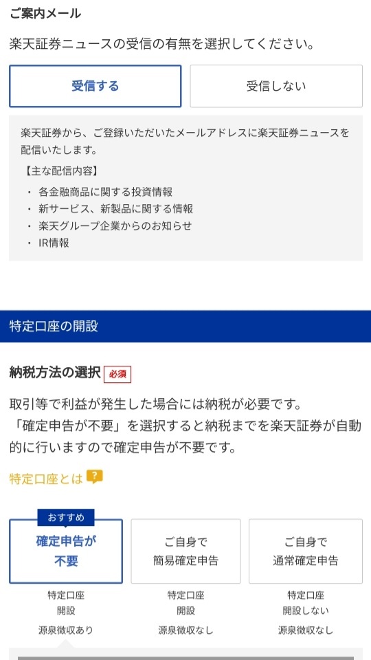 주소를 입력했으면 다음으로는 전화번호를 입력해주자. 그러면 개인정보는 모두 입력을 하였으니 다음으로 넘어가게 된다. 이제부터는 계좌에 대한 선택란이 나타나게 된다. 읻란 먼저 안내메일은 받아보기로 하였다. 다음에는 특정계좌(特定口座) 개설 여부인데, 일본의 경우도 역시 금융소득을 신고를 해야하는 법이 있다. 물론 연간 20만엔 이하로 돈을 벌게 되면 세금신고를 할 필요는 없지만, 그래도 세법에 대해 잘 모르고 세금문제가 생기면 비자에 문제가 생길 수 있으니 나는 증권사가 대신하여 세금신고를 대행해주는 특정계좌로 선택을 하였다.